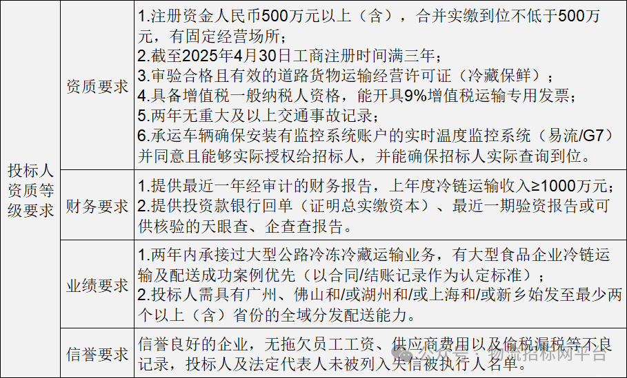应立高食品股份有限公司及其下属分、子公司、实际控股公司等关联企业(下称立高集团)业务发展需要,现对【立高集团】2025年度物流项目进行公开招标,竭诚欢迎符合要求的公司参加本项目。